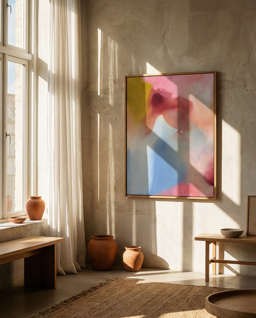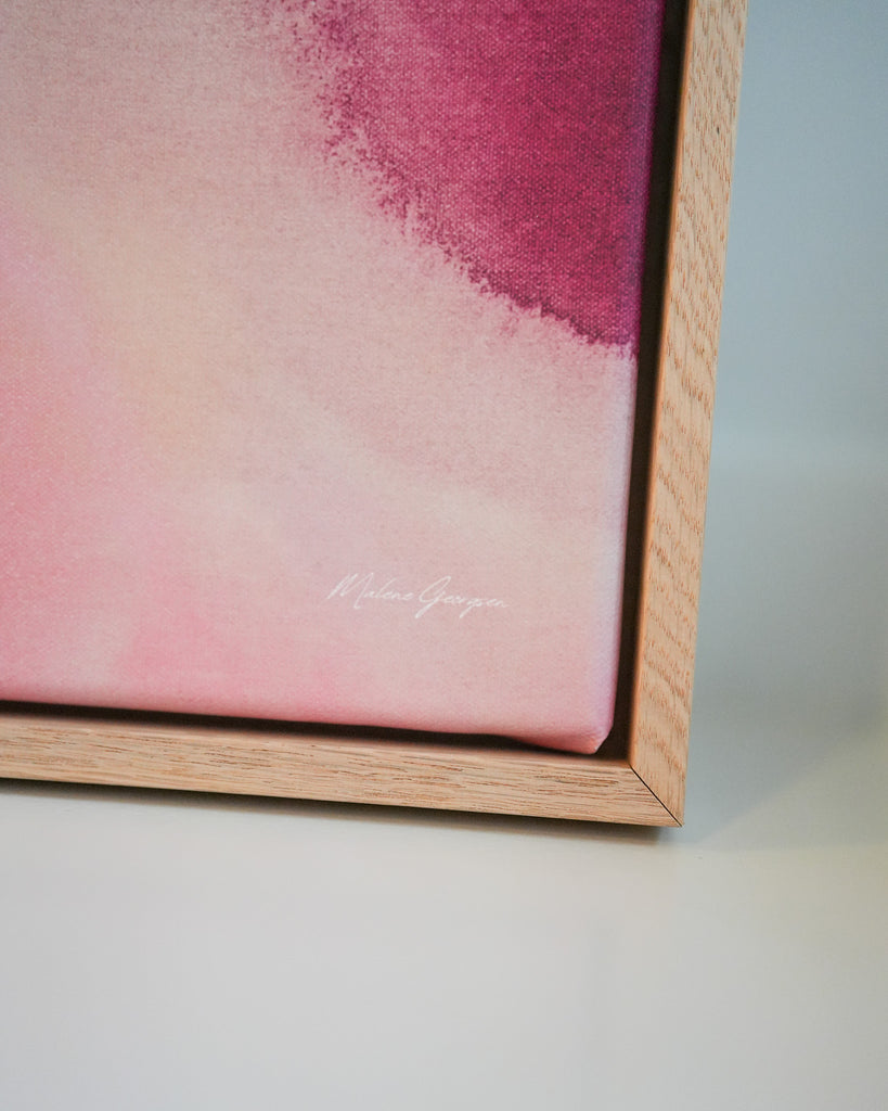 I Danmark: Vælg mellem opspændt på blindramme og indrammet i egetræ for et færdigt og smukt resultat lige til at hænge op, eller få det leveret i en rulle til lokal indramning.