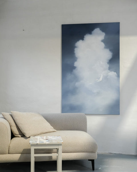Serien er inspireret af drømme. Jeg ønsker, at værkerne skal bringe en følelse af velvære, varme og romantik ind i rummet – og minde os om, at himlen altid er der, lige over os.