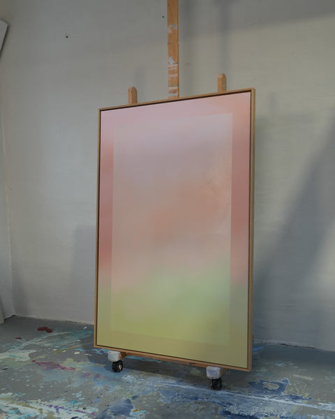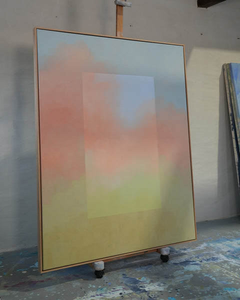 "I serien Portals arbejder jeg med ideen om porte som metaforer, jeg ser feltet som en dør forandring, grænser og nye begyndelser. Hvert maleri fungerer som et passagefelt — en visuel åbning hvor lys, farve og forskellige medier mødes og skaber rum for refleksion."